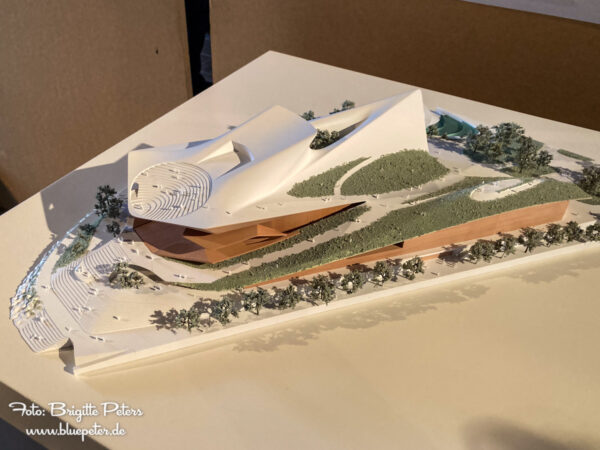 Beim Schreiben fällt mir auf, dass man sich heute gerne den Namen des Büros aus den Initialen des Chefs zusammenbaut. Statt Gerkan, Marg und Partner reduziert man auf die Anfangsbuchstaben gmp. Prof. Friedrich macht es genauso: pfp. Und unbedingt kleinschreiben, ganz bescheiden und unbedeutend wirken. Früher war das anders. Da hat man den vollen Namen mit Titel verwendet. Da hießen die Architekten Hans Scharoun, Frei Otto oder noch besser Egon Eiermann. Und sie haben die Modelle fein und detailliert gebaut, jedenfalls nicht so grob geschnitzt, wie man es beim Norweger sieht. Dafür kann man heute bei den Fotos punkten und das Gebäude so zeigen, als würde es schon auf dem Baakenhöft stehen.