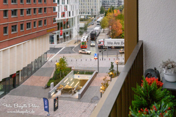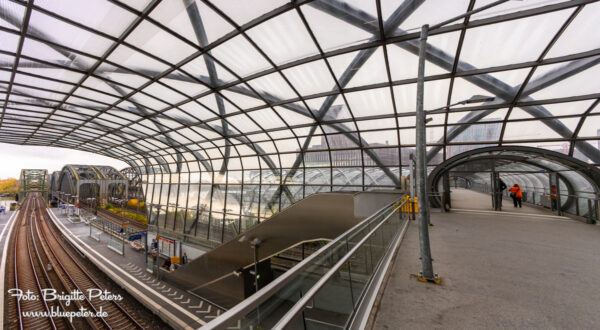 Nach dem verkehrsreichen Auftakt suchte ich mir ein besonders ruhiges Ziel für meinen Foto-Spaziergang aus. Mit meinem nagelneuen Deutschland-Ticket in der Tasche, U-Bahn geentert. Ziel: Bahnhof Elbbrücken. Dort überraschten mich die fast autofreien Straßen – Grund: Die Freihafen-Elbbrücke ist gesperrt. Eine Schiff-Kollision vor ein paar Tagen. Ja, richtig gelesen – ein Schiff rammte eine Brücke. Der LKW-Verkehr musste sich also kreativ neu sortieren.
